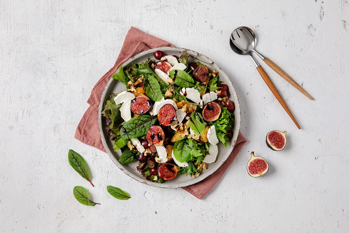 Juhlapöytään sopiva viikuna-vuohenjuustosalaatti tuo väriä ja raikkautta tuoreiden ainesosien myötä.